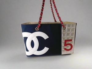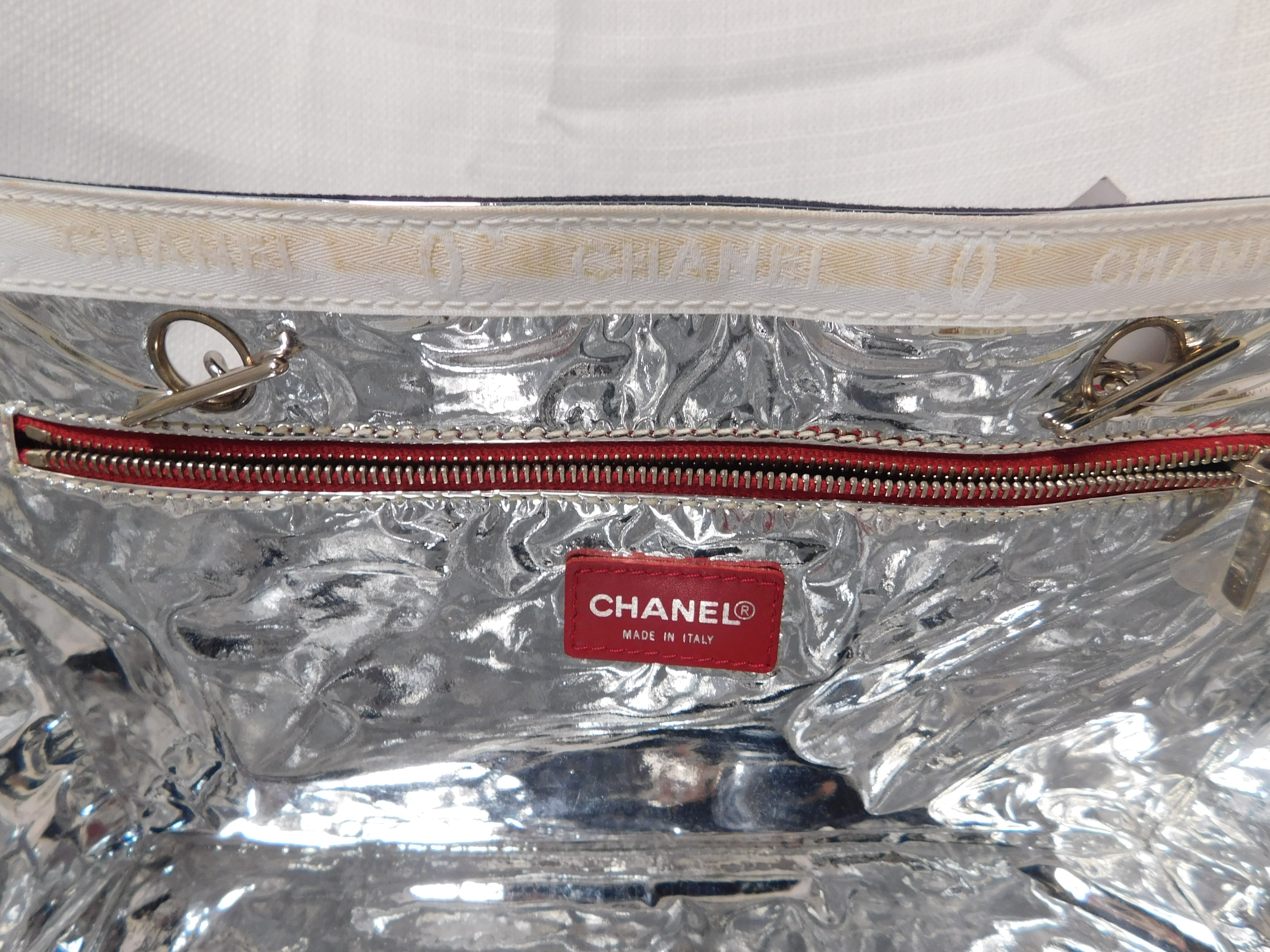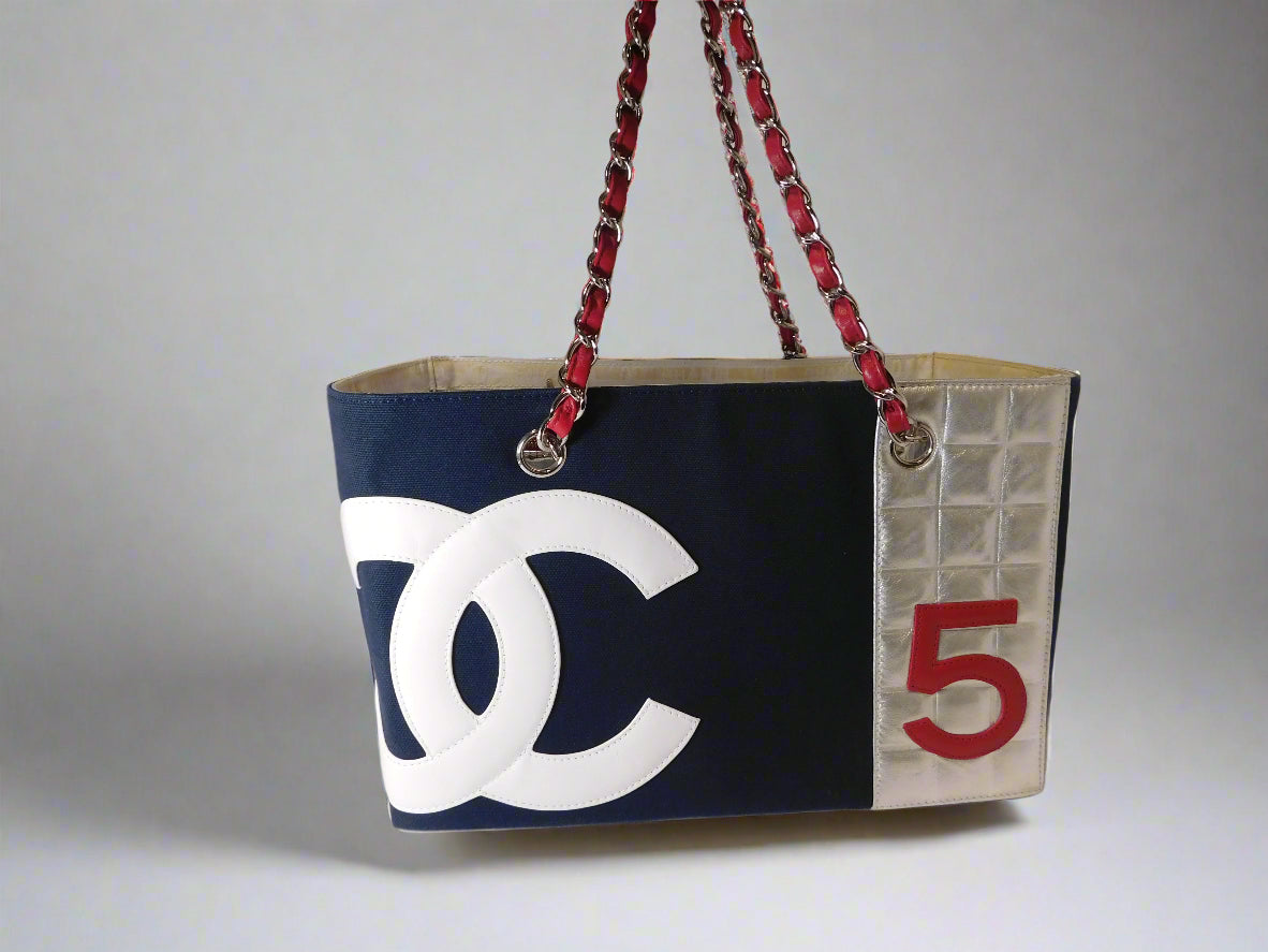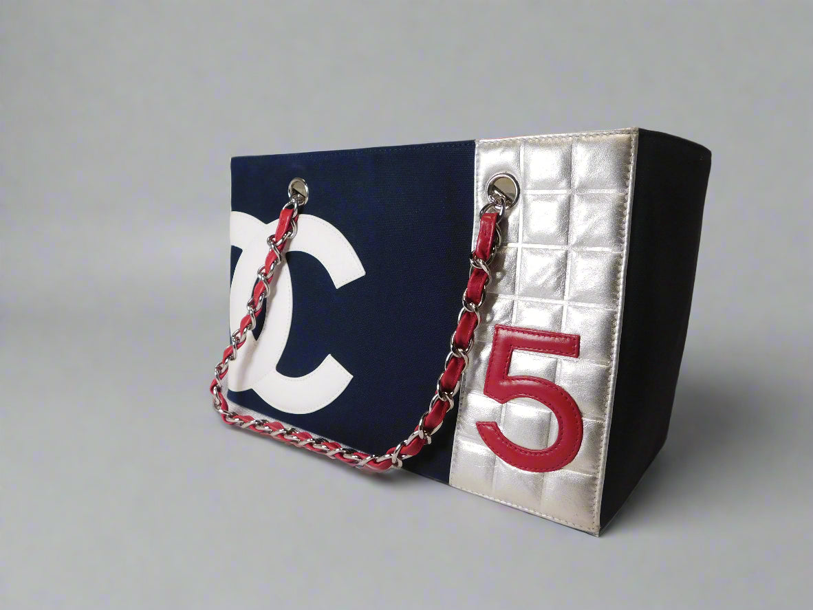 A bold statement piece, the Chanel N°5 Shopper Tote is crafted from quilted canvas with a striking metallic foil finish. Featuring a spacious open-top design, this tote is adorned with the iconic N°5 graphic print and signature CC logo for a modern yet timeless appeal. Dual chain-link and leather shoulder straps add a touch of classic Chanel elegance, while the roomy interior ensures effortless storage for everyday essentials.